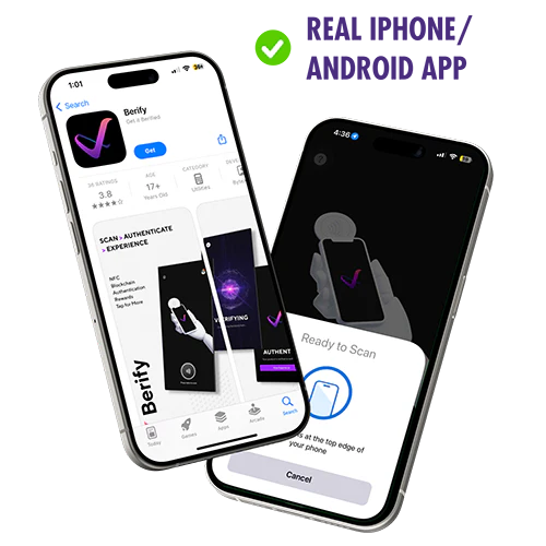 To authenticate with Berify, open the app and touch the top of your mobile device to the smart sticker to start the verification process.